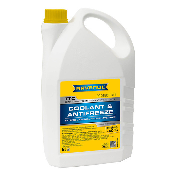 RAVENOL TTC Traditional Technology Coolant Premix -40°C – готовый антифриз на основе .. моноэтиленгликоля, не содержит силикаты, нитриты, амины, фосфаты. Обеспечивает долговременную (до 3 лет) антикоррозионную защиту всех металлов, присутствующих в двигателе, включая алюминий и различные сплавы.